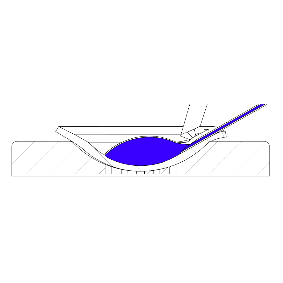 Das Corneaskleralscheibchen wird in die Vertiefung des Endoglide DMEK überführt. Von dort aus wird die eingerollte Lamelle mit dem Ladungszängchen sanft in die Kartusche gezogen. Die Kartusche wird mit dem violetten Handgriff („Loading“-Seite nach oben!) verbunden.